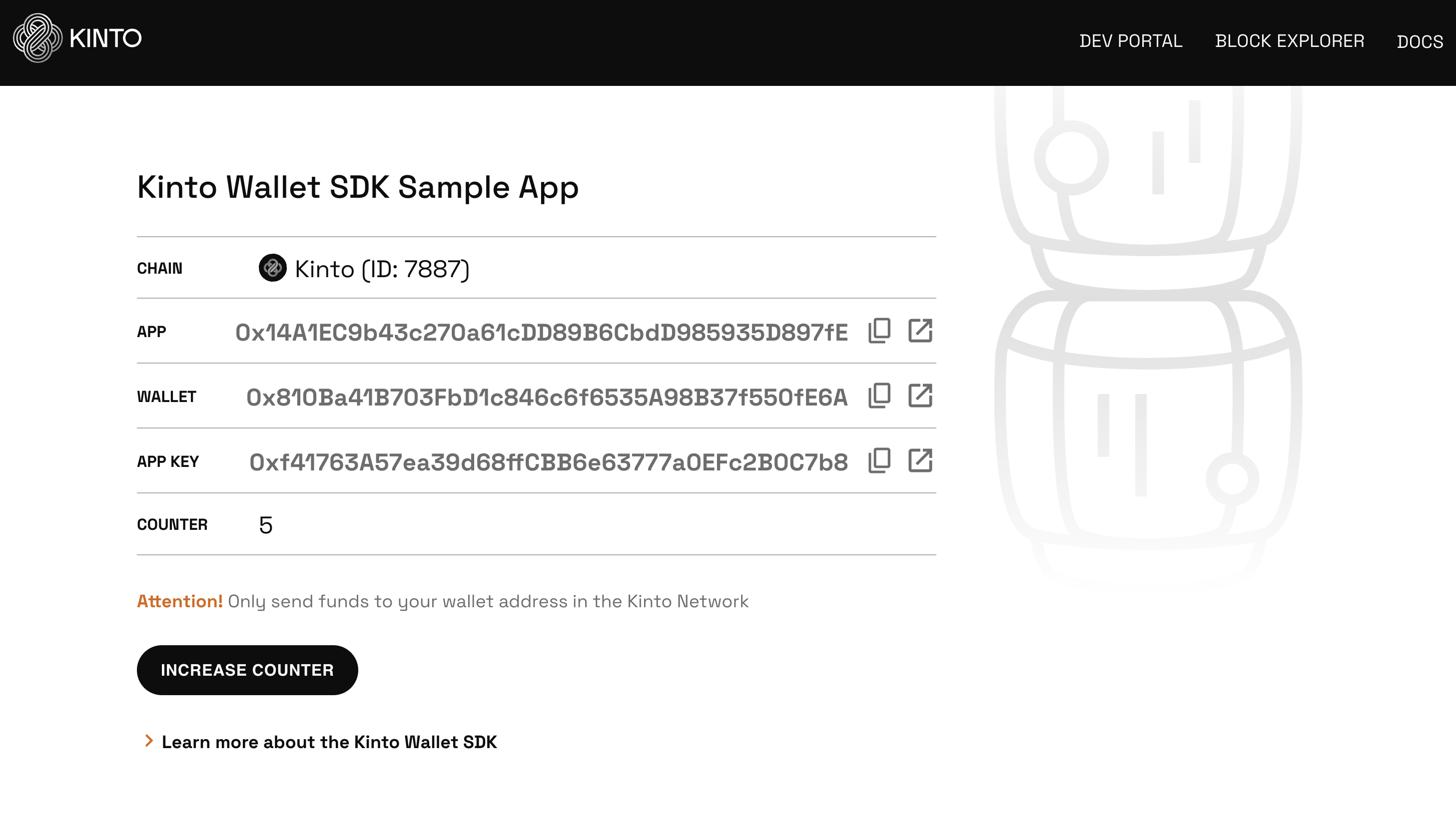 The [**Sample Counter App**](https://github.com/KintoXYZ/react-sdk-sample) demonstrates how to integrate and use the Kinto Wallet SDK in a real-world React application, in this case a counter contract that Kinto users can increase.