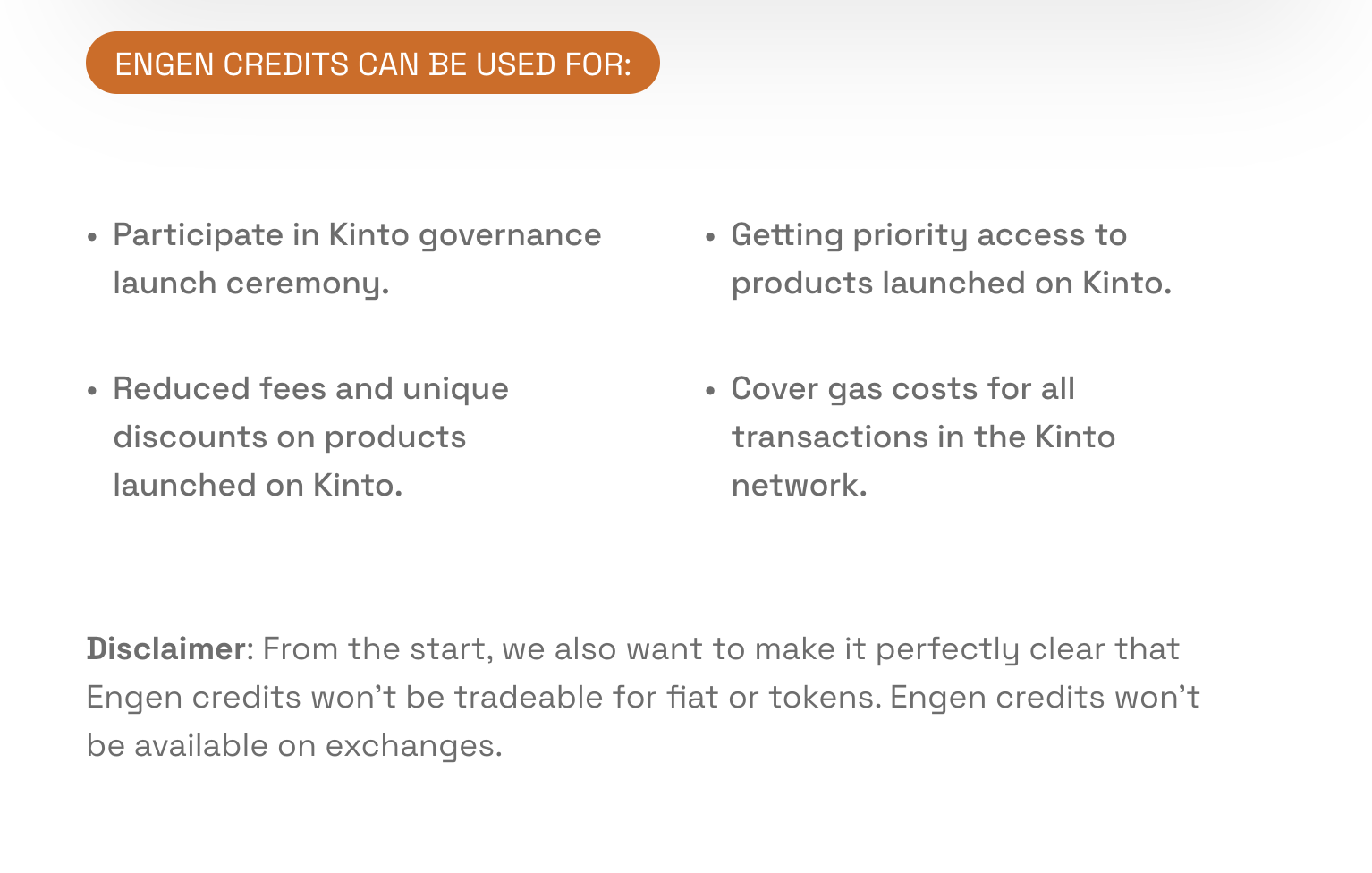 The ENGEN token is a non-transferable, non-tradeable ERC-20 token used to bootstrap the Kinto network. $ENGEN holders are the founding participants of Kinto. As such, they will receive unique benefits moving forward, including a gas refund for all the gas spent during the launch program, a gas subsidy to cover their transactions on Kinto, and exclusive benefits on future initiatives, like the 15% boost on the Mining program.