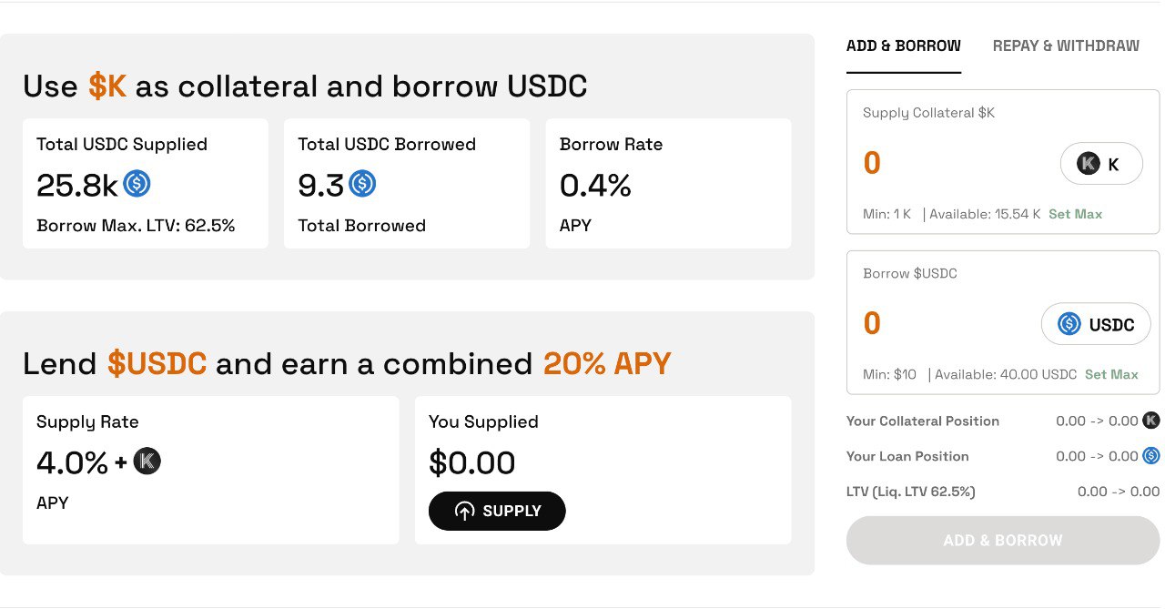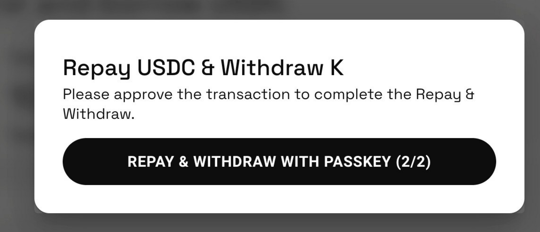 In the 'Repay & Withdraw' section, input the amount of USDC you wish tor repay and the amount of $K you will withdraw will be autopopulated. When you're happy with the selection, click 'Repay & Withdraw' to continue.&#x20;